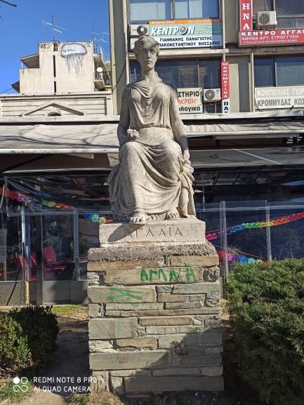 Στη βάση του αγάλματος υπάρχουν σημεία βανδαλισμού.