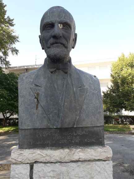 Ορειχάλκινη προτομή του Γεωργίου Καλούδη. Τα αποκαλυπτήρια έγιναν το 1991.