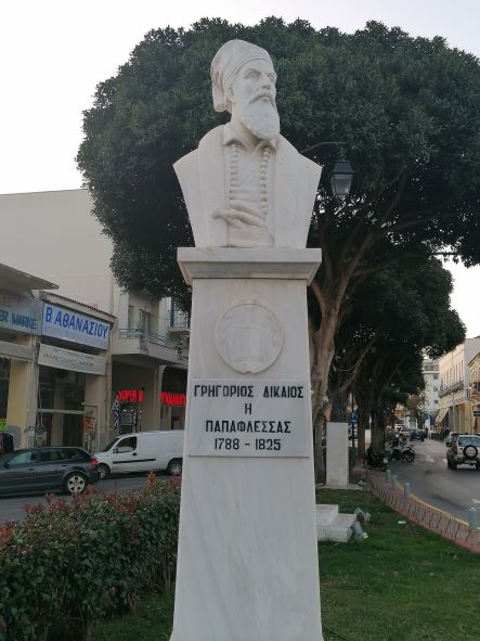 Η μαρμάρινη αυτή προτομή του Γρηγόριου Δικαίου -ο γνωστός σε όλους Παπαφλέσσας- είναι δημιούργημα του γλύπτη Κώστα Γεωργακά. Ο Παπαφλέσσας αποδίδεται με πυκνή γενειάδα, μαντήλι στο κεφάλι και πιστόλες ζωσμένες στην μέση του. Στην πρόσοψη του βάθρου υπάρχει ανάγλυφο μετάλλιο το οποίο αναπαριστά ένα σπαθί και ένα ανοιχτό βιβλίο ανάμεσα σε φύλλα δάφνης. Από κάτω ακολουθεί η επιγραφή: