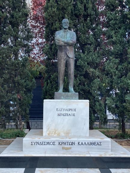 Το άγαλμα απεικονίζει τον Ελευθέριο Βενιζέλο, γεννήθηκε στο χωριό Μουρνιές, κοντά στην πόλη των Χανίων, στις 23 Αυγούστου 1864 και ήταν το πέμπτο παιδίτου Κυριάκου Βενιζέλου, εμπόρου, και της Στυλιανής Πλουμιδάκη, η οποία καταγόταν από το χωριό Θέρισο.Μεγάλωσε στα Χανιά αλλά λόγω διώξεων του πατέρα του από την οθωμανική διοίκηση πέρασε μέρος των παιδικών του χρόνων στα Κύθηρα και την Ερμούπολη. Πέρασε τις εγκύκλιες σπουδές του στα Χανιά, στο λύκειο Αντωνιάδη στην Αθήνα και στο Δημόσιο Γυμνάσιο Αρρένων Σύρου στην Ερμούπολη, απ´ όπου αποφοίτησε, και εργάστηκε στο κατάστημα του πατέρα του. Το 1881 εγγράφηκε στη Νομική σχολή του Πανεπιστημίου Αθηνών, απ´όπου αποφοίτησε το 1887. Αφού προσπάθησε ανεπιτυχώς να εκλεγεί δις εφέτης, άνοιξε δικηγορικό γραφείο καταφέρνοντας σε μικρό χρονικό διάστημα να διακριθεί. Το 1888 ανέλαβε μαζί με τους Χαράλαμπο Πωλογεωργάκη, Κωνσταντίνου Φούμη και Ιάκωβο Μοάτσο την αρχισυνταξία και την έκδοση της εφημερίδας «Λευκά Όρη». Από αυτήν αποχώρησε λίγους μήνες αργότερα για προσωπικούς λόγους.