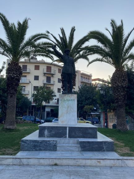 Το άγαλμα απεικονίζει τον Κωνσταντίνο Δαβάκη, γεννήθηκε στα Κεχριάνικα του νομού Λακωνίας το 1897. Έδειξε από μικρός έφεση στα πολεμικά πράγματα και με το που ενηλικιώθηκε σπούδασε στην Σχολή Ευελπίδων από την οποία και αποφοίτησε ως Ανθυπολοχαγός Πεζικού τον Οκτώβρη του 1916). Συνέχισε τις σπουδές του στην Ανώτατη Σχολή Πολέμου στην Αθήνα και αργότερα στην γαλλική Σχολή Αρμάτων στο Παρίσι. Μετά την έξωση του Κωνσταντίνου και την είσοδο της Ελλάδας στον Α Παγκόσμιο Πόλεμο έλαβε ενεργό μέρος στις συγκρούσεις εναντίον των Βουλγάρων στο Σκρα και την Δοϊράνη όπου και δέχτηκε σοβαρό πλήγμα στην υγεία του από τα αέρια που εμφανίστηκαν για πρώτη φορά στα πεδία των μαχών. Με την λήξη του πολέμου προβιβάστηκε σε λοχαγό επ’ ανδραγαθία. Συμμετείχε στην Μικρασιατική Εκστρατεία όπου και τιμήθηκε με το Χρυσούν Αριστείον Ανδρείας διακρινόμενος το 1921 στις μάχες που δόθηκαν στα υψώματα του Αλπανός. Μετά την ήττα παρέμεινε στον ελληνικό στρατό μέχρι την αποστράτευση του το 1937 για λόγους υγείας.
