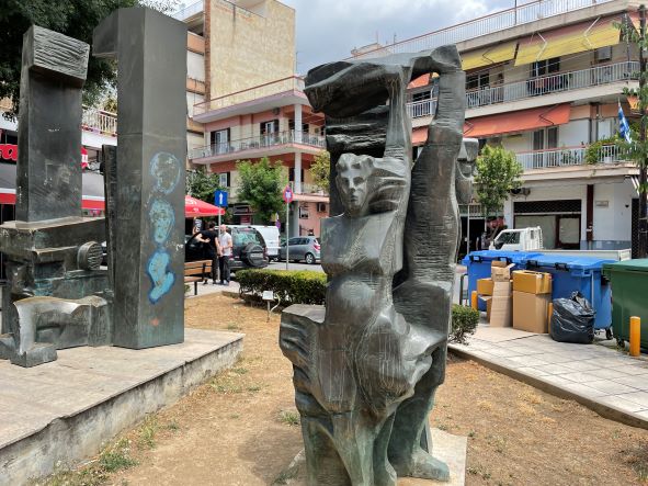 Σύνθεση που αποτελείται από δύο μέρη με κυβιστικές και κοντρουκτιβιστικές επιρροές που μας δίνουν τις μορφές ως γεωμετρικά σχήματα και δίπλα σε όγκους με έντονες γραμμές και σκληρές αποκλίσεις. Βλέπουμε την μορφή ενός άντρα και μιας γυναίκας να σηκώνουν τα χέρια ψηλά μια πολύ συνηθισμένη αναπαράσταση σε αγάλματα για την αντίσταση σε όλη την Ελλάδα. Στο διπλανό τμήμα μια μορφή πεσμένη ανάμεσα σε γεωμετρικούς όγκους που θέλουν να δώσουν την αίσθηση του χώρου που μπορεί να είναι το κρησφύγετο συμβολίζει όσους ηρωικά χάθηκαν στην μάχη είτε εκτελέστηκαν από τους Γερμανούς. Τοποθετημένο σε μια γωνία ενός κυκλικού κόμβου δυο κεντρικών δρόμων χάνει κάτι από την δυναμική του αποτελεί παρ’ όλα αυτά μια ασυνήθιστη αναπαράσταση περισσότερο αφαιρετική και φουτουριστική.