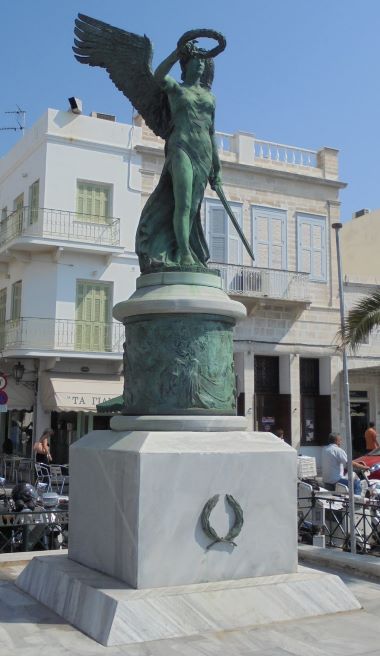 Το γλυπτό αναπαριστά μια ολόσωμη γυναικεία μορφή η οποία φέρει φτερά στην πλάτη, φορά μανδύα και κρατά ένα δάφνινο στεφάνι στο προτεταμένο δεξί της χέρι και ένα σπαθί στο αριστερό της. Αναπαριστά προφανώς τη Νίκη. Έχει πυκνά μαλλιά και το δεξί της πόδι, ακάλυπτο, βρίσκεται ελάχιστα πιο μπροστά από το αριστερό. Το γλυπτό εδράζεται σε βάθρο δύο επιπέδων: το πρώτο επίπεδο είναι ορθογώνιο και φέρει στην πρόσοψη του ανάγλυφο ορειχάλκινο δάφνινο στεφάνι. Στις δυο έτερες πλευρές αναγράφονται τα παρακάτω λόγια: