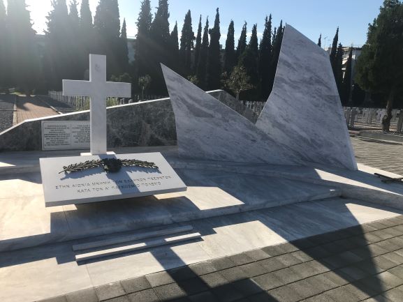Πρόκειται για μια σύνθεση από μάρμαρο τοποθετημένη στον Γαλλικό τομέα δίπλα από την κόκκινη εκκλησία που παραπέμπει με συμβολισμούς στην εποχή και τα γεγονότα του πρώτου μεγάλου πολέμου. Το σκούρο μάρμαρο που αποτελεί την πίσω πλευρά του μνημείου συμβολίζει την γραμμή του Μακεδονικού μετώπου ενώ οι δύο κάθετες λευκές μαρμάρινες πλάκες αναφέρονται στην προσπάθεια των Ελληνικών δυνάμεων της Αντάντ να διασπάσουν το μέτωπο. Οι μαρμάρινες λευκές επιφάνειες έχουν σχήμα φτερών σαν ένα περιστέρι αφηρημένης μορφής και προσέγγισης που συμβολίζει την νίκη, την αγνότητα και την ειρήνη. Στο κέντρο του μνημείου δεσπόζει ένας μαρμάρινος σταυρός και μια αφιέρωση «Στην αιωνία μνήμη των Ελλήνων πεσόντων κατά τον Α παγκόσμιο πόλεμο». Στα δεξιά παρουσιάζετε ο Πολεμικός σταυρός του Α παγκοσμίου πολέμου από ορείχαλκο. Το μνημείο κατασκευαστικέ με μέριμνα της 737 Διεύθυνσης στρατιωτικών έργων του Γ Σώματος Στρατού, του Γενικού Επιτελείου Στρατού και τα αποκαλυπτήρια του έγιναν στις 30 Σεπτεμβρίου του 2017. Στις 30.09.2018 επέτειο συμπλήρωσης ενός αιώνα από την λήξη του πολέμου ο πατριάρχης Βαρθολομαίος φύτεψε μια ελιά σύμβολο της ειρήνης και ομονοίας στο πίσω μέρος του μνημείου.