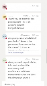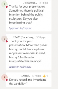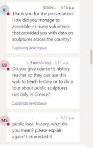 Με μεγάλη επιτυχία ολοκληρώθηκε η συμμετοχή της Ψηφιακής Γλυπτοθήκης μας στο Public History Summer School που διοργανώθηκε διαδικτυακά και παρουσιάστηκε σε ένα διεθνές κοινό. Η Ψηφιακή Γλυπτοθήκη κέντριζε το ενδιαφέρον των συμμετεχόντων οι οποίοι υπέβαλαν μία σειρά από ερωτήματα και ακολούθησε έναν γόνιμος διάλογος.